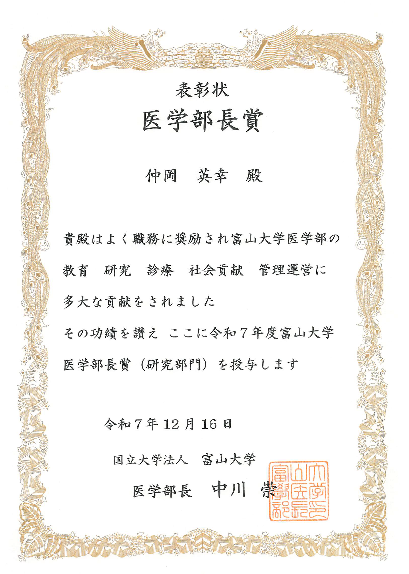 さらに、仲岡英幸先生は**令和7年度 富山大学医学部長賞(研究部門)**にも選出されました。本賞は、富山大学における研究活動の中でも、特に顕著な成果を挙げた取り組みに贈られるものであり、日頃の地道な研究の積み重ねと高い学術的貢献が認められたものです。