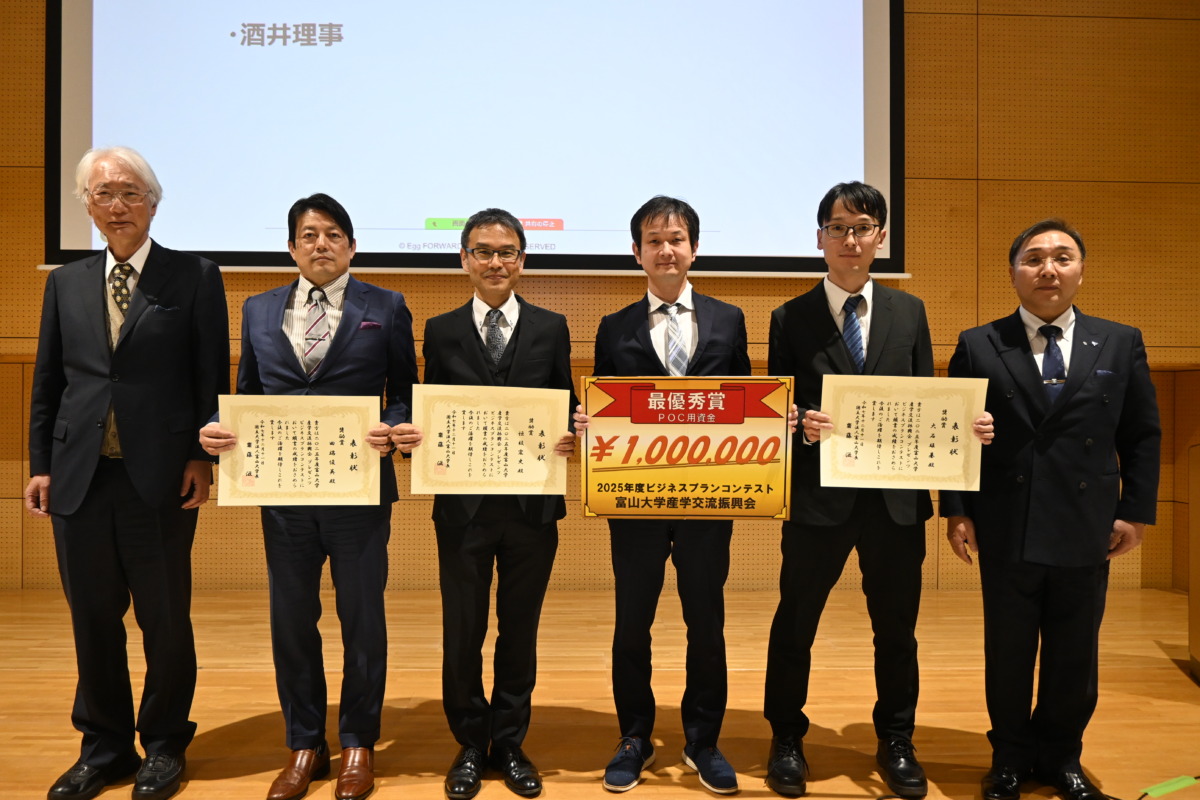 まず、富山大学産学交流振興会 presents ビジネスプランコンテストにおいて、最優秀賞を受賞されました。本コンテストは、富山大学における産学連携・研究成果の社会実装、ならびに起業支援を目的として開催されている学内向けのコンテストであり、その中での最優秀賞受賞は、研究の将来性、社会的意義が高く評価された結果です。